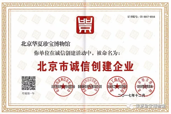 北京华夏珍宝博物馆受邀并出席了本次诚信盛典,凭借在2017年专业、规范、诚信经营等方面的突出表现,华夏珍宝博物馆荣获“北京市诚信创建企业”的称号。实至名归,可喜可贺。