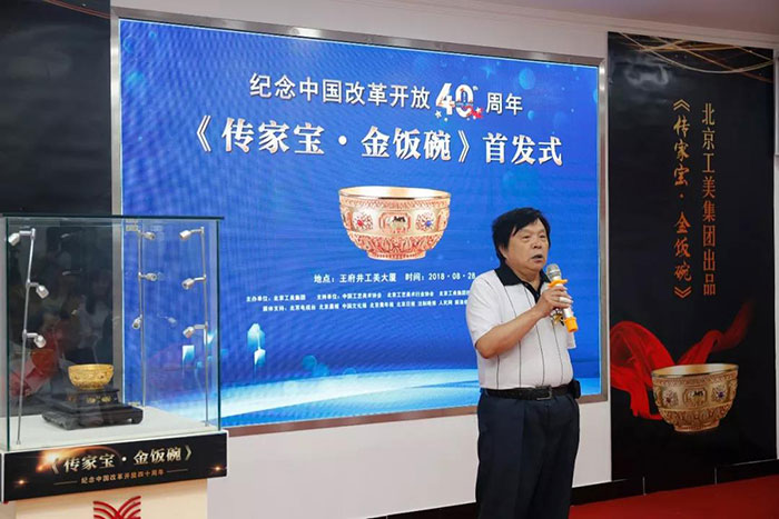 北京工美联合企业集团董事长李节说:“金饭碗花丝工艺历史悠久,工艺繁杂,为改革开放40周年纪念做作的这款金饭碗,做工精细,造型精美,而且采用了贵金属,确实可以作为传家宝。在这里我也祝愿所有的来宾,能有这样一只金饭碗,祝大家手捧金饭碗,财源滚滚来。”