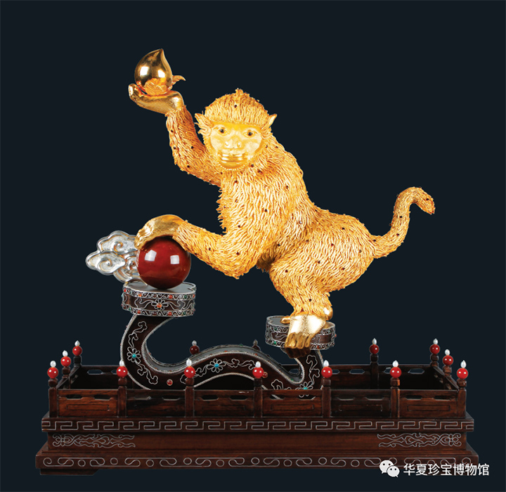 取“金猴献寿”之寓意,金猴脚踏红木“如意”,生动灵巧,神态怡然,预示着万事顺意,事业如步青云;掌托仙桃,呈现出“金猴献寿”之吉祥寓意。