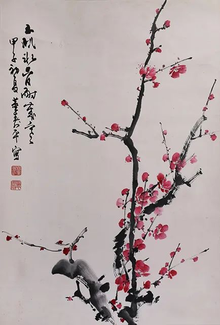 董寿平所写朱砂红梅、疏密有致,浓淡相宜 , 简繁得体,赏心悦目、其最大特点是长于取势,巧妙经营,将梅花傲雪斗霜的无畏精神,蕴含于花枝摇曳的动势之中。