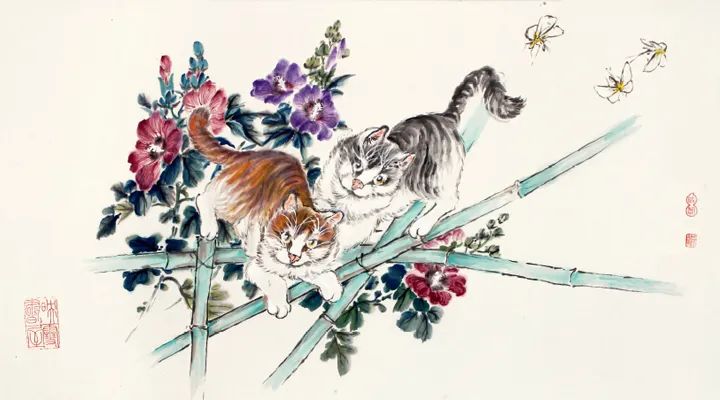 观赏孙菊生的作品,常常给人温情的感动。画面内容多取材生活中的常见之物,取景颇具趣味性。他擅于表现猫好奇与好玩的天性,笔下的猫姿态各异,或相互嬉戏,或扑蝶逐燕,甚至与落红、竹筐、篱笆也能玩成一气。头侧歪,爪轻踮,尾翘扬,猫的灵动之态呼之欲出,俏皮可爱又惹人怜爱。