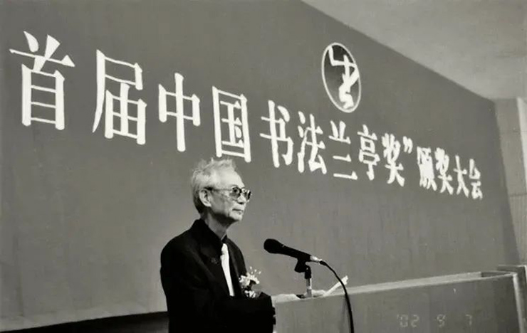 2002年9月,沈鹏在“首届中国书法兰亭奖颁奖大会”上讲话