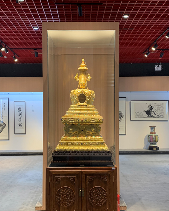 一进入博物馆,一座珠光宝气的佛塔映入眼帘。“中华金佛宝塔”采用藏式如来八塔之“尊胜塔”的造型精制而成。运用了錾刻、锤鍱、镶嵌等多种工艺,细腻精湛,各类宝石点缀其间,更显出其高贵、华丽。即便是放到各大国家级博物馆中,此塔也是极为珍罕的佛塔中之精品。