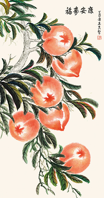 除领袖肖像画外,王其智还以画桃闻名于世。他笔下的桃艳而不俗,巧而不失拙,拙而不失雅。其干遒劲有力,枝繁叶茂且绿意葱茏。桃实疏密交错,其色浓淡相间,前色显而不俗,后色淡而有味。令人不禁想起《西游记》中王母娘娘蟠桃园中的仙桃。王其智独具特色的画桃艺术,得到了画坛众多专家学者的一致认同,被赞誉为继吴昌硕、齐白石后又一画桃大家。